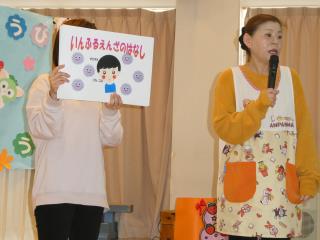あすかの湯交流会です。お遊戯を披露したり、手遊びや肩たたきで交流し、楽しい時間を過ごしました。