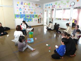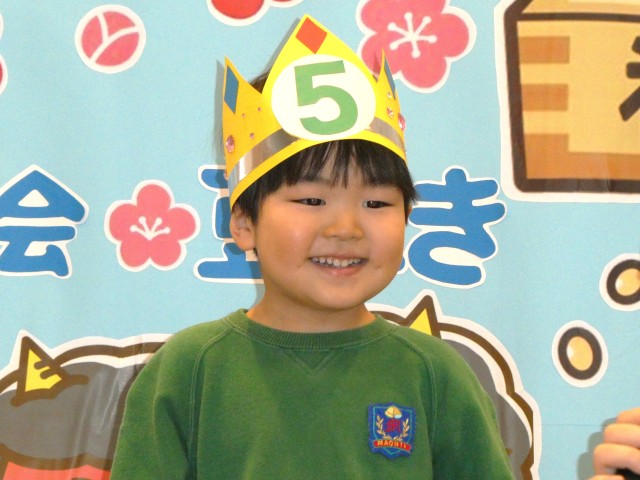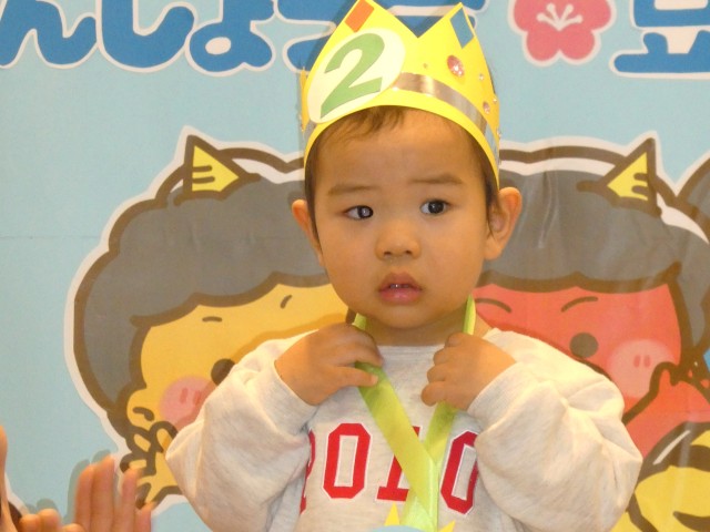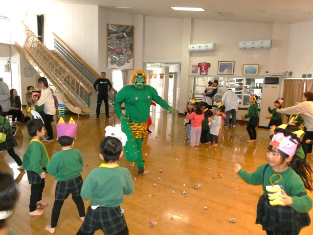 2月の誕生会と豆まき会をしました。最初に2月生まれの園児をみんなでお祝いし、その後鬼の登場です。みんなで紙で作った豆をぶつけながら鬼を退治しました。
