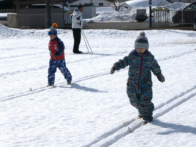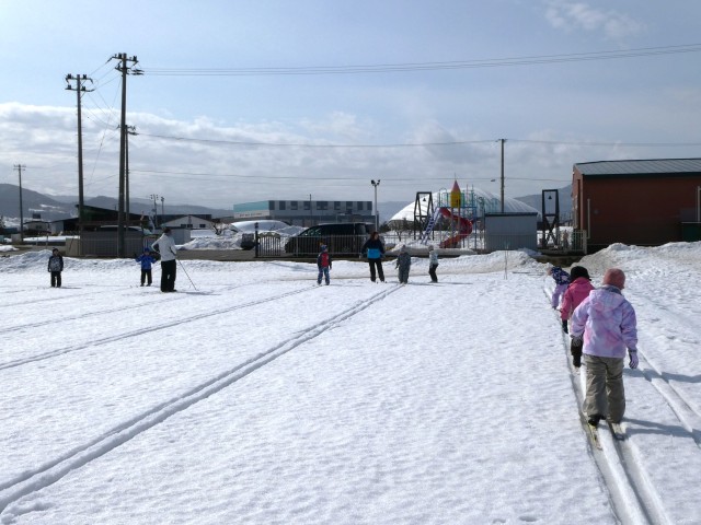 毎年、きりん組は冬の体力作りで「歩くスキー」と「縄跳び」をしています。田んぼに行き、歩くスキーに悪戦苦闘しながらも、最後には競争が出来るまで上達しました。